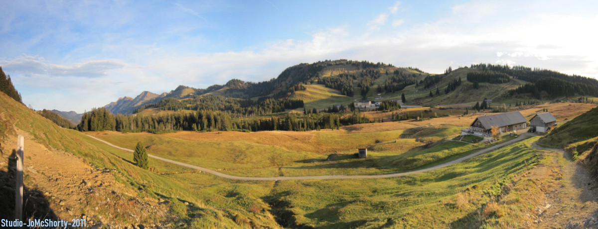Heute geht es noch höher hinaus. Wir fahren über Scheffau, Richtung Vorarlberg nach Langen. Abzweig nach Doren, Krummbach, Hittisau links Richtung Hochhäderich. Geparkt wird auf dem großen Parkplatz vor dem Almhotel.